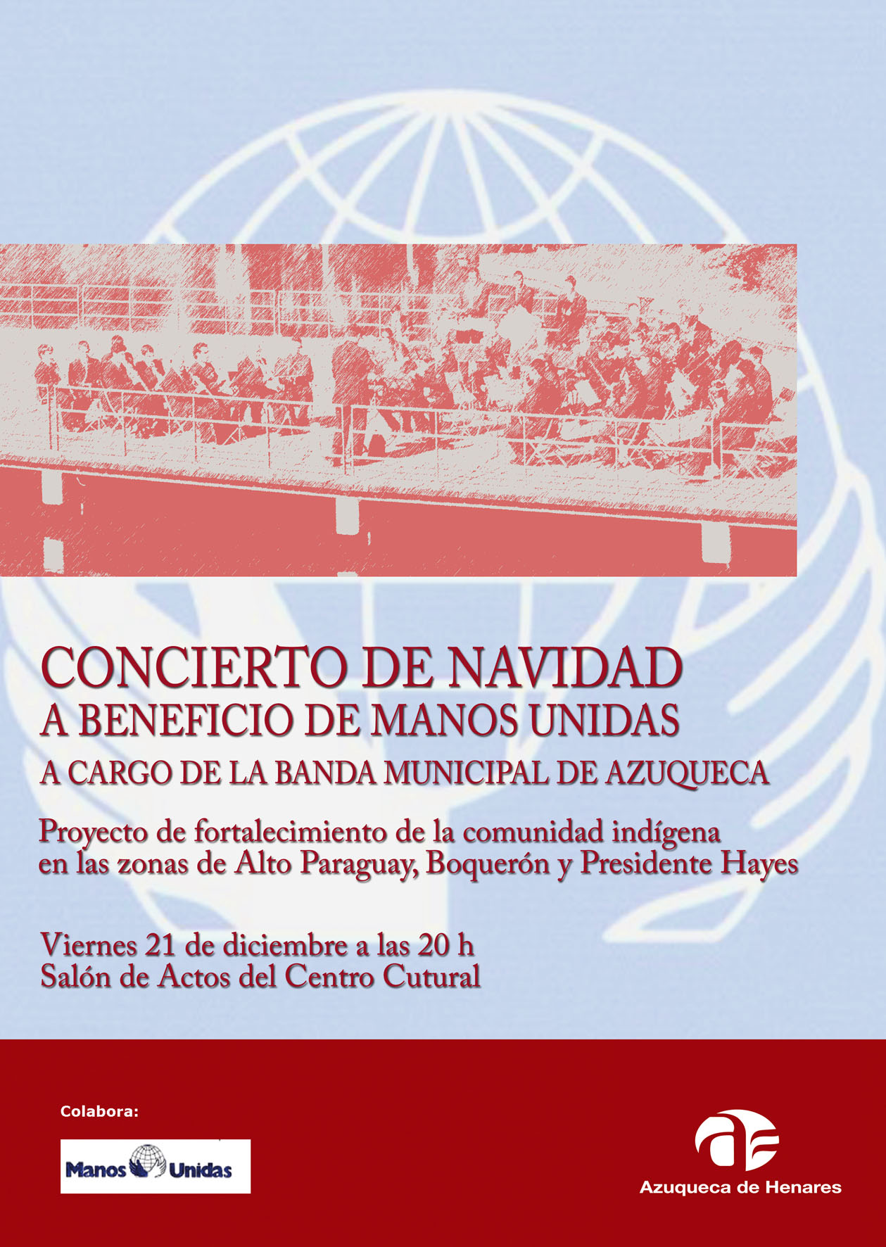 La Banda de Música de Azuqueca ofrece este viernes, a partir de las 20 horas, el tradicional concierto de Navidad en la Casa de la Cultura. La entrada es libre, pero a la entrada del concierto se situará una mesa de Manos Unidas cone l objetivo de recaudar fondos para financiar un proyecto denominado 'Fortalecimiento de la comunidad indígena y promoción de sus artesanías' que la organización desarrolla en Paraguay y del que se beneficiarán directamente artededor de medio centenar de personas de los departamentos Alto Paraguay, Boquerón y presidente Hayes. La concejala de Cultura y Cooperación, Sandra Yagüe, ha agradecido a la Banda su disposición a colaborar "en la difusión de la Cultura a través de la música y también su disposición a participar en otras iniciativas, especialmente en la que como esta, tienen un cariz solidario".