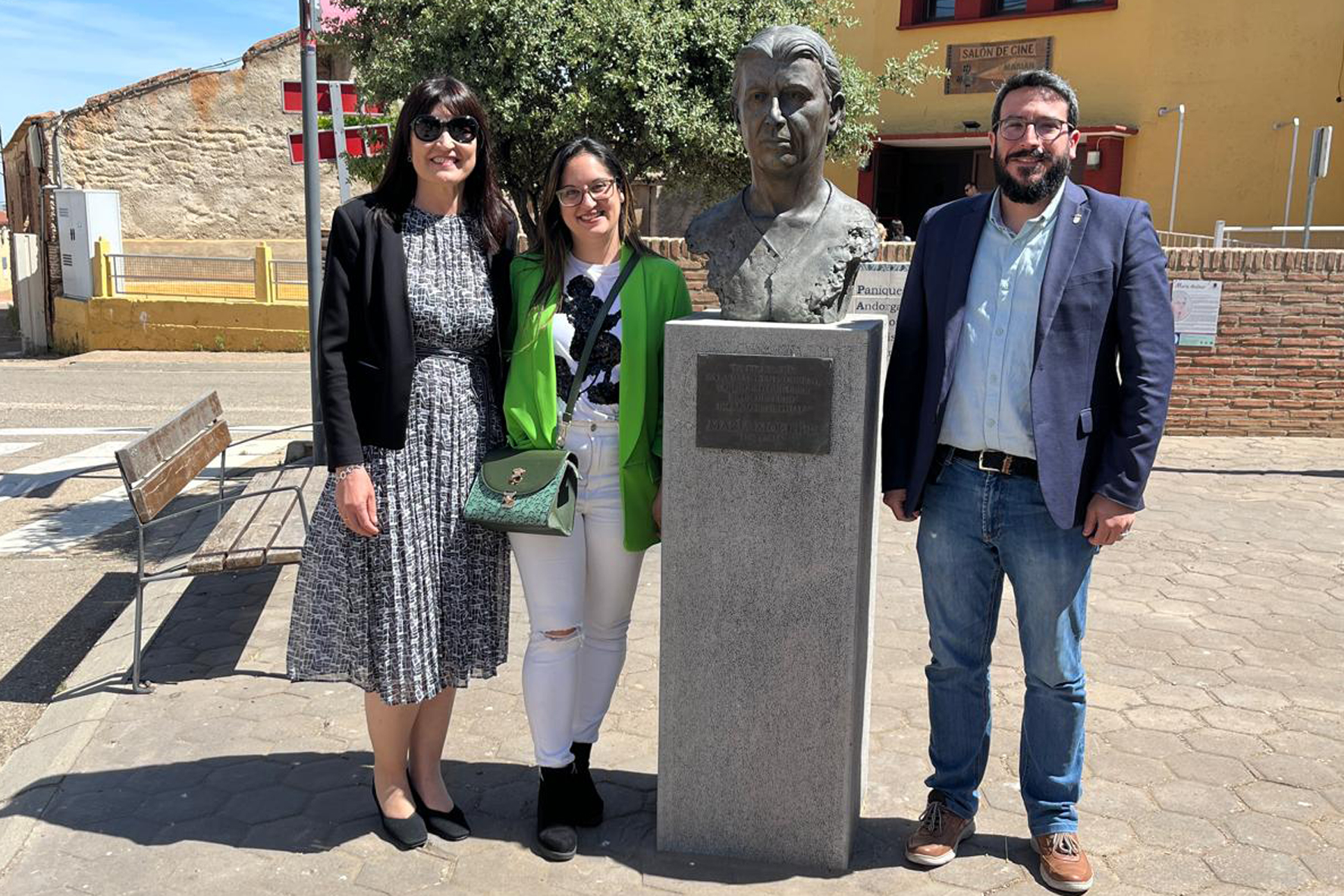 La directora de la Biblioteca Municipal, la concejala de Cultura y el alcalde de Azuqueca, junto al busto de María Moliner en Paniza. Fotografía: Ayuntamiento de Azuqueca