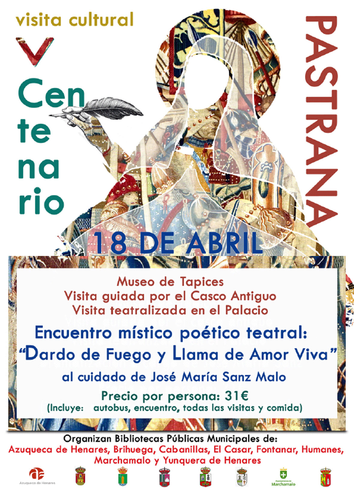 Con motivo del V centenario de Santa Teresa, la Biblioteca Municipal Almudena Grandes, junto con las bibliotecas de Brihuega, Cabanillas del Campo, El Casar, Fontanar, Humanes, Marchamalo y Yunquera de Henares, organiza una visita cultural a Pastrana, dirigida a los clubes de lectura y al público en general.La actividad se celebrará el sábado 18 de abril y contempla una parada en el Museo de Tapices, un recorrido guiado por el casco antiguo de la localidad y una visita teatralizada al Palacio, donde José María Sanz Malo protagoniza un encuentro místico y poético titulado 'Dardo de fuego y llama de amor viva' El precio por persona es de 31 euros, con traslado en autobús, entradas y comida incluidas. Las personas interesadas pueden inscribirse en la Biblioteca Municipal de Azuqueca, o bien, en el teléfono 949 34 84 67 y en el correo electrónico