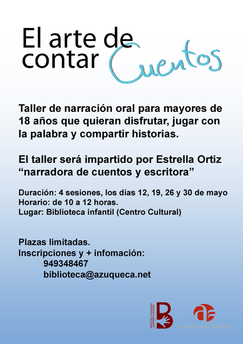 Bajo el título "El arte de contar cuentos", la biblioteca municipal 'Almudena Grandes' ha convocado un taller de narración oral dirigido a mayores de 18 años, que impartirá la narradora y escritora Estrella Ortiz. La actividad se desarrollará en las instalaciones de la sala infantil (planta baja de la Casa de la Cultura), a lo largo de cuatro sesiones de dos horas, de 10 a 12, los días 12, 19, 26 y 30 de mayo.El número de plazas es limitado y los interesados pueden obtener más información y formalizar su asistencia en la biblioteca, a través del teléfono 949 34 84 67 o del correo electrónico