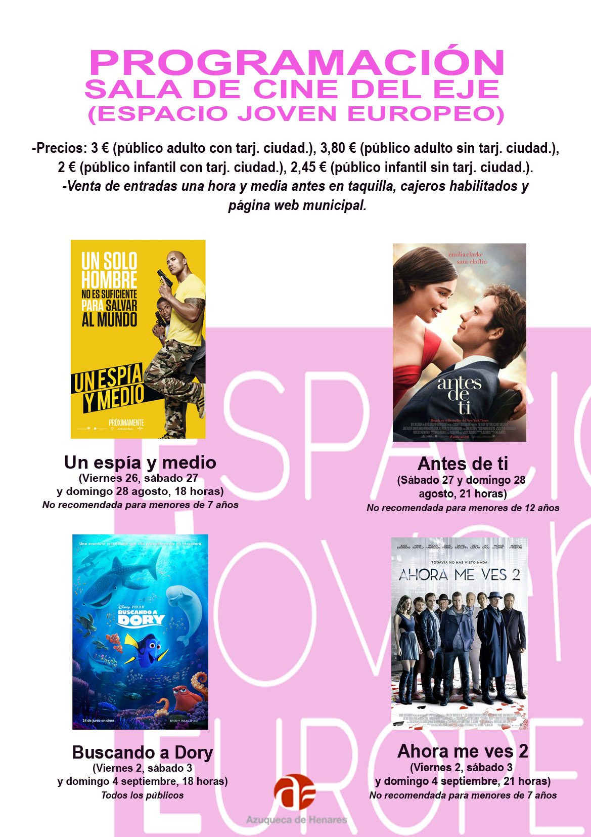 La oferta cinematográfica se renueva cada semana en Azuqueca. El próximo fin de semana, del 26 al 28 de agosto, el EJE ofrece dos películas. Por un lado, la comedia de acción ‘Un Espía y Medio’. Una película norteamericana, dirigida por Rawson Marshall Thurber y protagonizada por Dwayne Johnson, más conocido bajo el apodo de ‘La Roca’. Se proyectará el viernes, sábado y domingo a las 18 horas. No está recomendada para menores de 7 años.Por otro lado, la película también americana, ‘Antes de ti’, un drama romántico dirigida por Thea Sharrock , basada en la novela de la periodista y escritora británica, Jojo Moyes. Se exhibirá el sábado 27 y domingo 28, a las 21 horas. Esta producción cinematográfica no está recomendada para menores de 12 años.Las entradas para las dos películas que se exhibirán en el EJE tienen un coste de 3 € (público adulto con tarjeta ciudadana), 3.80 (público adulto sin tarjeta ciudadana), 2 € (público infantil con tarjeta ciudadana) y 2.45 € (público infantil sin tarjeta ciudadana). Se pueden adquirir en la web municipal, en los cajeros ciudadanos y en taquilla una hora y media antes del pase.Cine de veranoPor otra parte, coincidiendo con la época estival, se proyectará un nuevo título al aire libre, en el ciclo de ‘cine de verano’, que cada viernes tiene lugar en el patio del antiguo cuartel. Esta semana, el día 26 de agosto, será el turno de ‘Trash, ladrones de esperanza’, una película británica, del director Stephen Daldry, que cuenta una historia ambientada en las favelas de Río de Janeiro.La película se estrenó en 2014 y recibió, entre otros, el premio del público en el Festival de Roma. Las entradas para esta película tienen un precio de 2 euros y se pueden adquirir en los cajeros ciudadanos, la web municipal y una hora y media antes del pase, en las taquillas. La proyección comenzará a las 22 horas y no está recomendada para menores de 12 años.