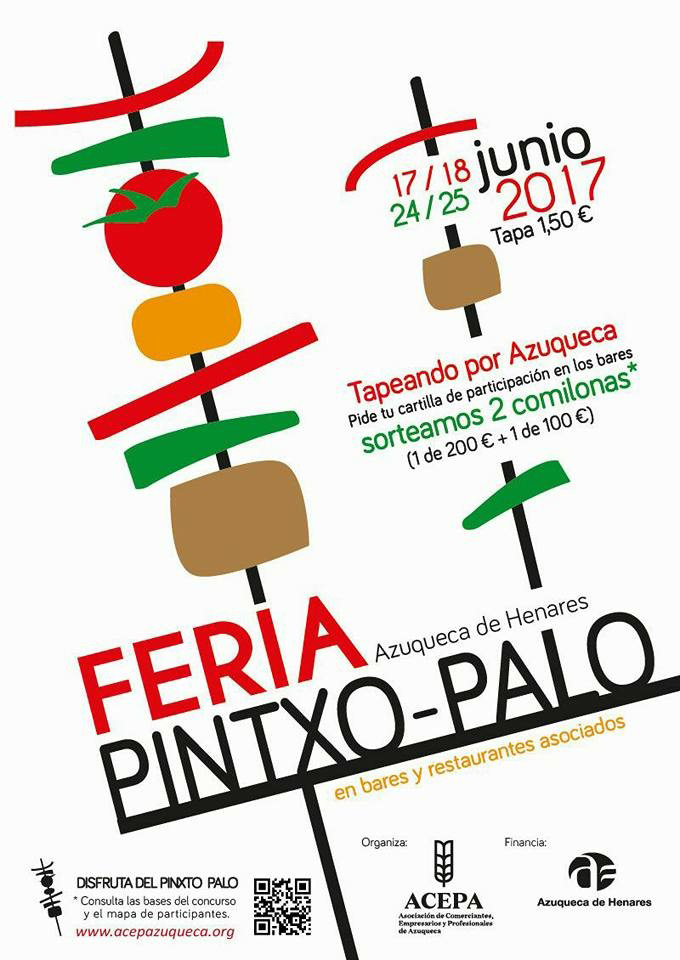 'Feria Pintxo-Palo' es el nombre que se ha dado a una nueva campaña de promoción de los establecimientos hosteleros de Azuqueca organizada por ACEPA (Asociación de Comerciantes, Empresarios y Profesionales de Azuqueca) y financiada por el Ayuntamiento azudense. Se trata de una ruta que propone tapear en los diez bares y restaurantes que se han adherido a la convocatoria. El requisito que se ha fijado es que las tapas se sirvan a los clientes en un pincho o palo, por un precio de 1,50 euros. La organización ha elaborado una cartilla para que los clientes que prueben cuatro de los 'pintxos' participantes y los valoren. Ente quienes depositen las cartillas en las urnas preparadas al efecto, se sorteará una comida por importe de 200 euros y otra valorada en 100 euros. Cada tapa tendrá un precio de 1,50 euros.La concejala de Comercio, Sagrario Bravo, ha destacado "la importancia del pequeño comercio, en este caso del secotr de la hostelería, para hacer ciudad" y se ha referido a la "estrecha colaboración entre el Ayuntamiento y ACEPA que se viene plasmando en distintos programas y campañas".Establecimientos participantes y tapas-Restaurante 'Los olivos de Castilla': Pincho moruno estilo olivos (lomo de cerdo, berenjena, calabacín, pimiento verde, pimiento rojo con salsa barbacoa).-Bar 'La Botica del abuelo': Brocheta de Ferrero-Roche de morcilla con manzana y salsa de piquillos.-Restaurante 'Casa Tito': Brocheta de pollo, bacon y champiñones.-Bar-Bodega 'El Buen Humor': Pintxo Burguer.-Bar 'El Segoviano'. Brocheta de langostinos y piña a la plancha.-Cervecería Noma: Brocheta de cachopo con cabrales y cecina.-Taberna de Carlos: Gilda (pintxo típico vasco).-Bar 'La Abadía': Brocheta de pollo con trigueros y romanescu.-Bar Marcos: Brocheta de solomillo, plátano y reducción de frutos rojos.-Bar Travesía: Brocheta de cazón con salmorejo.