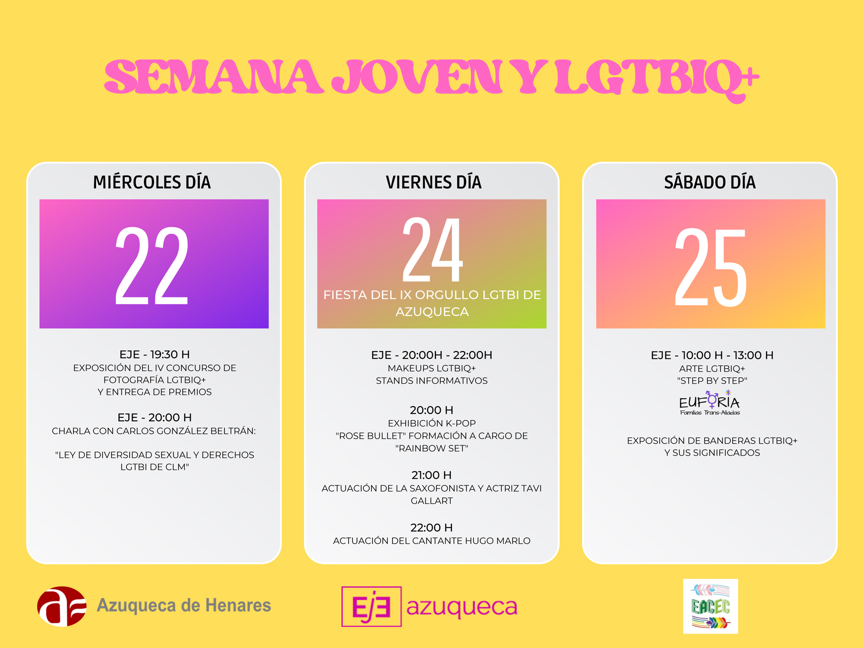 El acto central se celebra el viernes 24 y consiste en la fiesta del noveno Orgullo LGTBI de Azuqueca. A partir de las 20 horas, el EJE acoge maquillaje LGTBIQ+ y expositores informativos, una exhibición de baile K-Pop, la actuación de la saxofonista y actriz Tavi Gallart (21 h.) y el concierto del cantante Hugo Marlo (22 h.).