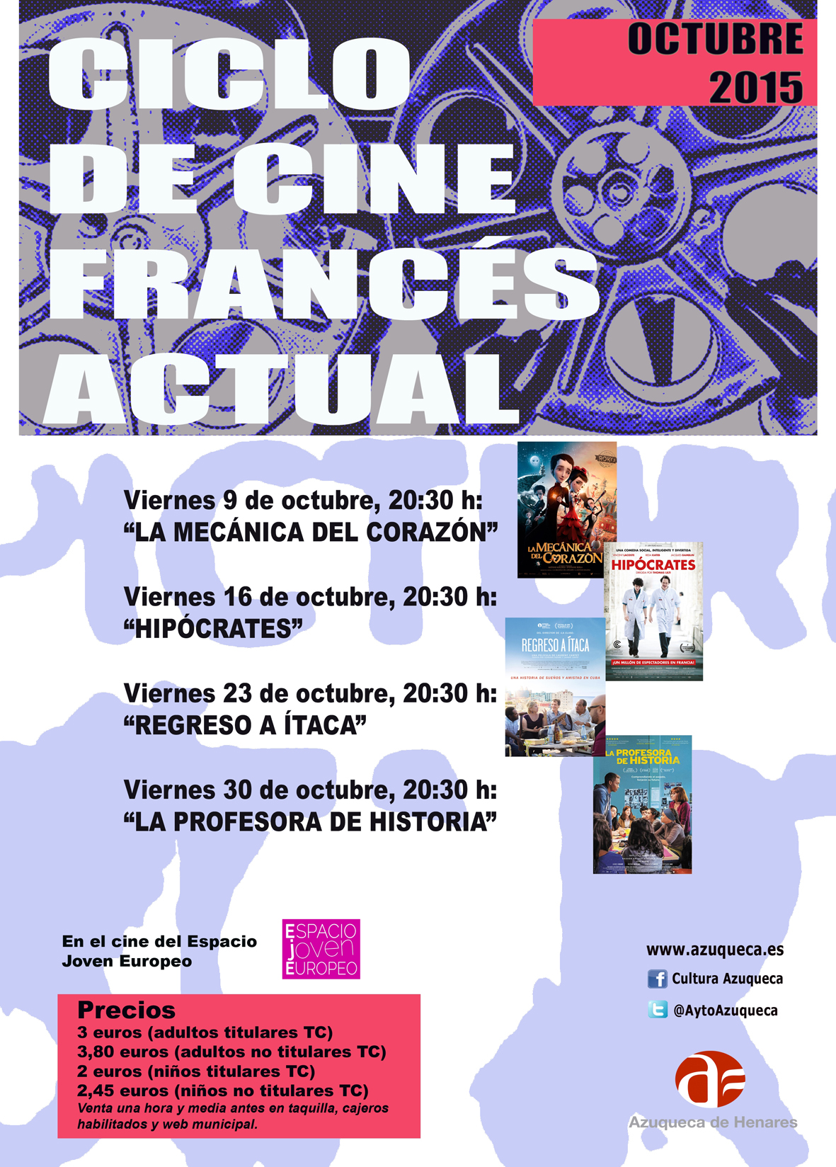 Este viernes, 9 de octubre, comienza el ciclo de cine francés actual que ha programado el Ayuntamiento de Azuqueca de Henares en la sala de Espacio Joven Europeo (EJE). En esta primera sesión, se proyecta la película de animación 'La mecánica del corazón'. La cartelera se completa con 'Hipócrates' (día 16), 'Regreso a Ítaca' (día 23) y 'La profesorsa de historia' (día 30). Todas las sesiones comienzan a las 20:30 horas.Por otra parte, la sala del EJE mantiene las proyecciones de cine comercial. En concreto, el viernes 9, sábado 10 y domingo 11 de octubre, a las 18 horas, se podrá ver 'Vacaciones', mientras que el sábado y el domingo, a las 21 horas, la propuesta es 'Un día perfecto'.En ambos casos, las entradas, con Tarjeta Ciudadana, cuestan 3 euros (adultos) y 2 euros (niños), mientras que los espectadores que carezcan de este documento municipal, deben abonar 3,80 y 2,45 euros, respectivamente.Teatro infantilLa agenda cultural del fin de semana en Azuqueca incluye también un espectáculo infantil y familiar: 'Jean Pierre, el pirata', de la compañía Calma Chicha Teatro. La función comienza a las 18 horas en el salón de actos de la Casa de la Cultura. Las entradas cuestan 4 euros.Las localidades del cine y el teatro se pueden adquirir de manera anticipada en esta web (pinche aquí) y en los cajeros ciudadanos, o en taquilla, el mismo día, hora y media antes del inicio.