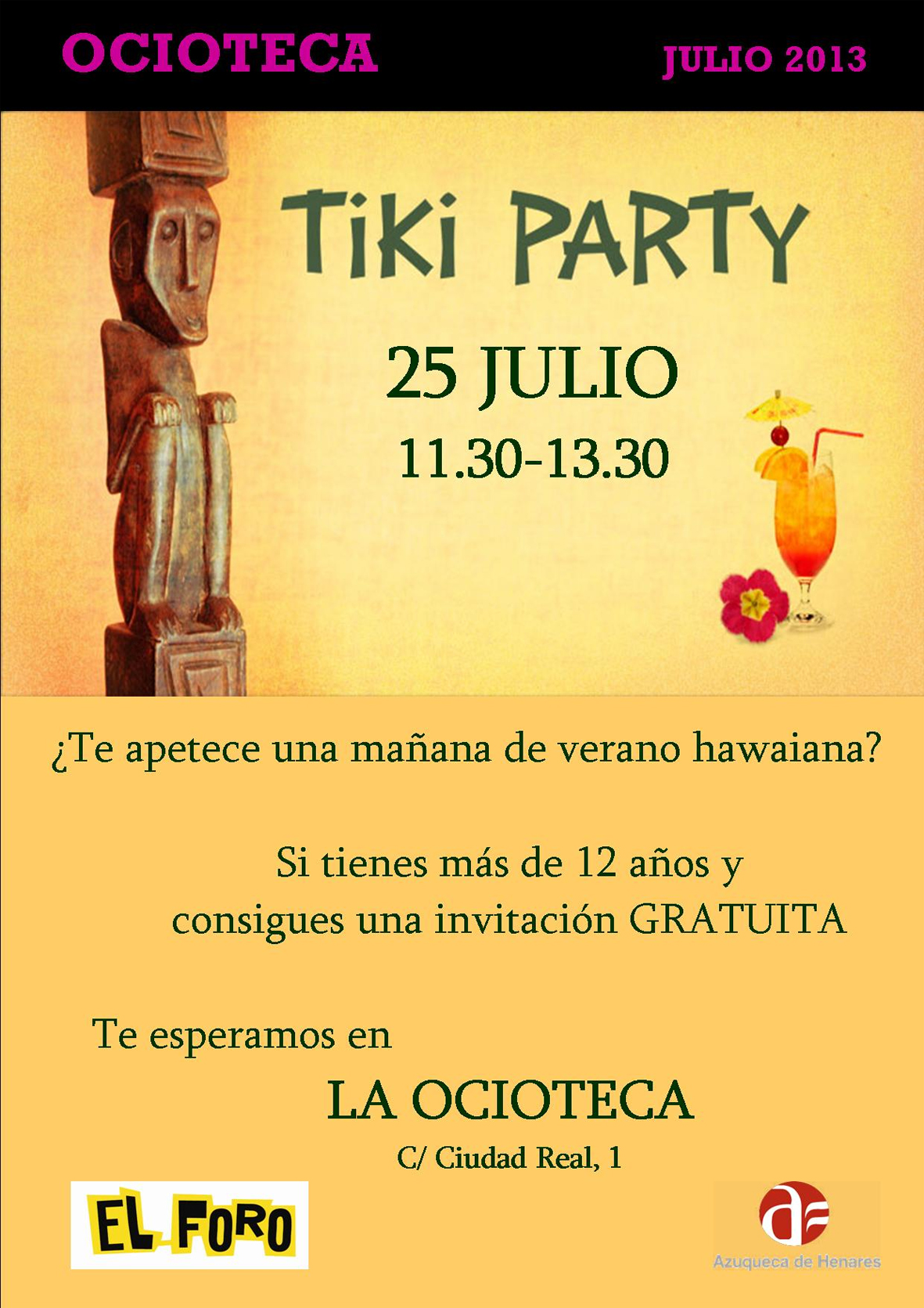 El Foro acoge el jueves 25 de julio, de 11:30 a 13:30 horas, una fiesta hawaiana dirigida a jóvenes a partir de 12 años. La actividad es gratuita y las invitaciones se pueden descargar en esta página web, en la sección de Juventud (pinche aquí).La fiesta, que se incluye dentro del programa municipal Ocioteca, permitirá que los participantes se acerquen la cultura hawaiana. “Además de conocer su música, danza y gastronomía, se van a organizar dos talleres: uno de diseño de ropa con papel reciclado y otro de regalos de verano a partir de golosinas”, adelanta la concejala de Juventud, Sagrario Bravo.La Ocioteca continúa en agosto con dos nuevas citas: visionado de cortos de animación (día 22) y un taller de marcapáginas estivales (día 29).Juegos y talleresPor otra parte, la concejalía de Juventud ha programado durante el verano juegos al aire libre y talleres creativos. En julio, las próximas citas son el jueves 25 con un taller de incensarios de madera (de 18 a 19:30 h., para jóvenes de 12 a 17 años y de 19:30 a 21 h., para mayores de 18 años) y el 26 de julio, de 10 a 11:30 h., con un juego de rastreo, en el parque de La Quebradilla.Ya en agosto, habrá talleres de tatuajes de henna (días 20 y 22) y de abalorios con goma eva y fieltro (días 27 y 29), además de una simulación del concurso 'Uno para ganar' (día 23) y juegos tradicionales (día 30).
