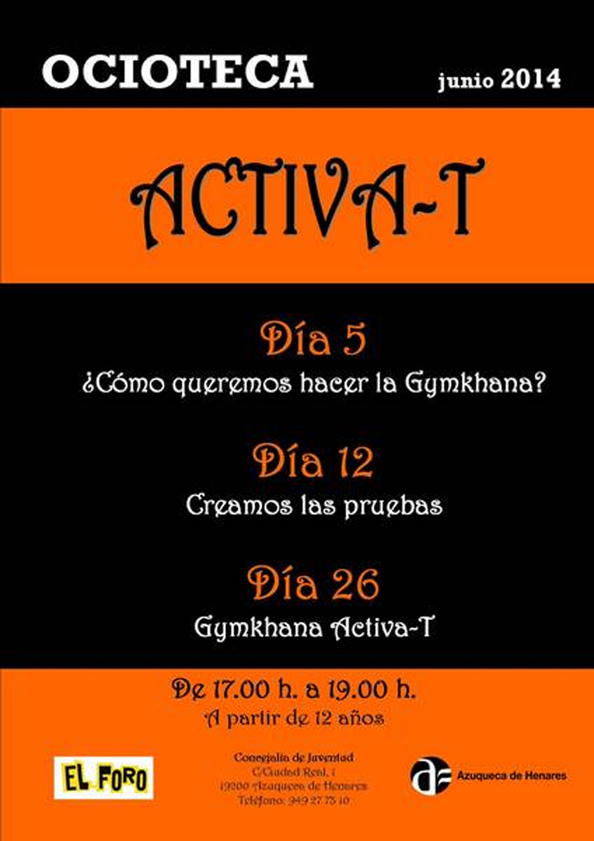 La Ocioteca de El Foro celebra tres sesiones en junio bajo el lema 'Activa-T en grupo'. El objetivo de esta propuesta, que se dirige a jóvenes a partir de los 12 años, es "fomentar la colaboración y el trabajo en equipo para idear pruebas divertidas y de ocio saludable que conformen una gymkhana que posteriormente se pondrá en práctica", explica la concejala de Juventud, Sagrario Bravo.Las citas se van a celebrar los días 5 (¿Cómo queremos hacer la gymkhana?), 12 (Pensamos y creamos las pruebas) y 26 de junio (Gymkhana 'Activa-T'), de 17 a 19 horas.Más actividadesPor otra parte, se mantiene abierta la inscripción en las salidas organizadas por el Ayuntamiento a Toledo (14 de junio, hasta 36 años) y al río Henares (este sábado, día 7 de junio, para jóvenes de 12 a 17 años). Más información, pinchando aquí.La agenda de actividades para los jóvenes azudenses incluye el taller monográfico 'Disfruta con tu coche este verano'. "Se trata de una sesión gratuita en la que los asistentes recibirán una serie de consejos y trucos para viajar con la máxima tranquilidad", avanza la edil. El taller se imparte el miércoles 18 de junio, de 19 a 20 horas, en El Foro. Las personas interesadas, que deben tener entre 18 y 35 años, pueden formalizar su participación en la Oficina Municipal de Información Juvenil (OMIJ) hasta el 14 de junio.Además, la Sala de Juegos acoge este viernes, desde las 17 horas, una partida de Play Station con un juego de Fórmula 1. Se dirige a jóvenes de 12 a 17 años y el plazo de inscripción se mantiene abierto hasta el 5 de junio.