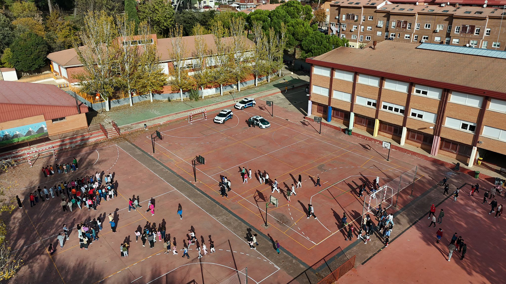 Imagen del simulacro en el CEIP Virgen de la Soledad tomada por la Unidad de Drones de la Policía Local. Fotografía: Ayuntamiento de Azuqueca