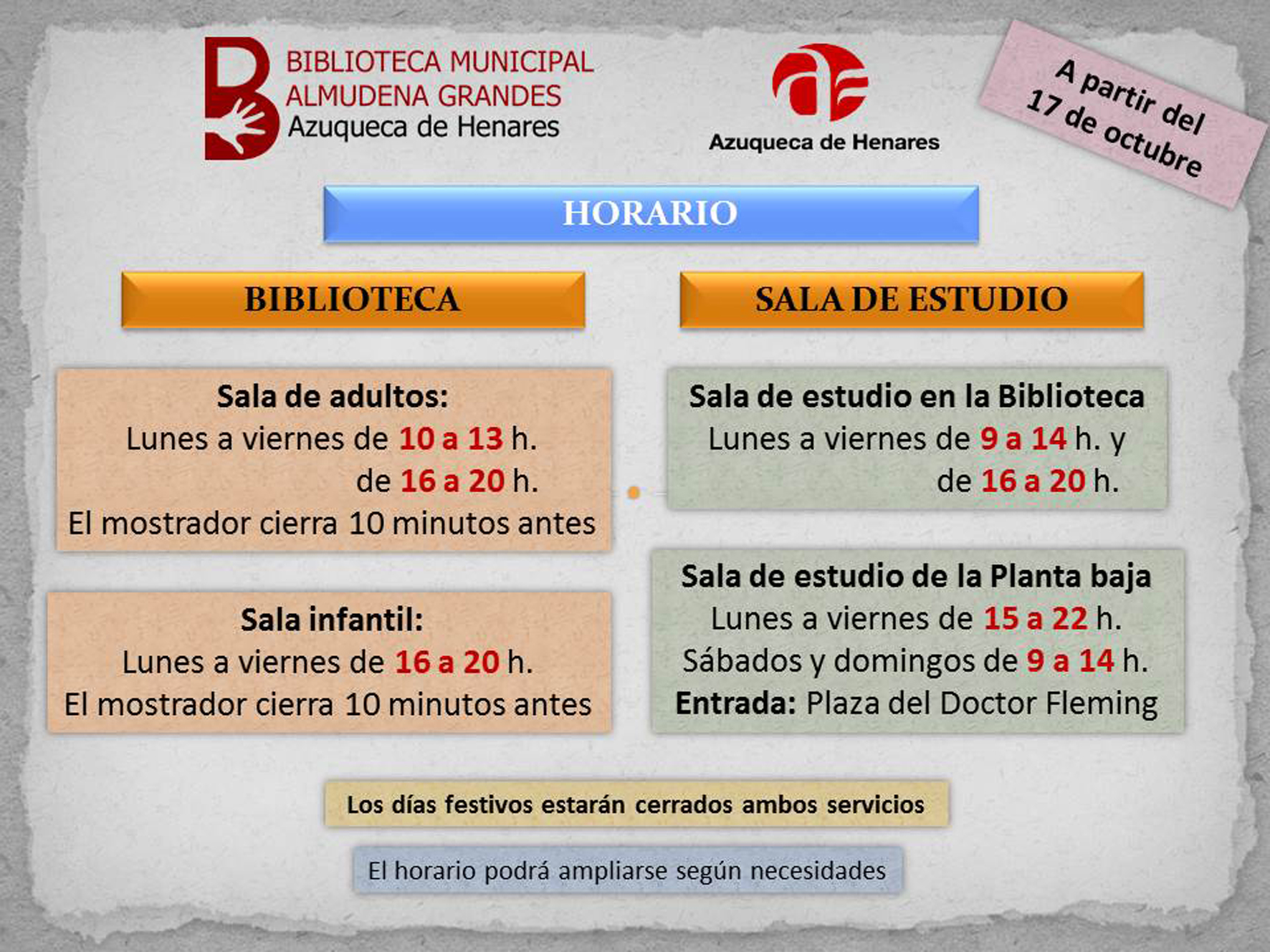 El Ayuntamiento de Azuqueca de Henares amplía el horario de apertura de las salas de estudio de la Biblioteca Municipal Almudena Grandes. “Somos una ciudad con un población joven y son muchas las vecinas y vecinos que necesitan instalaciones apropiadas para poder seguir avanzando en su formación y para preparar exámenes”, apunta el alcalde, José Luis Blanco, quien recuerda que la Biblioteca dispone de dos espacios para esa finalidad “con horarios de apertura que se van ajustando en función a la necesidades que nos trasladan las usuarias y usuarios”.