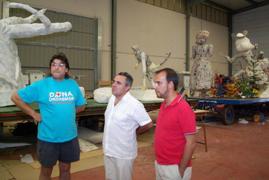 El alcalde, Pablo Bellido, y el concejal de Fiestas, Santiago Casas, visitaron la nave en la que trabajan los peñistas