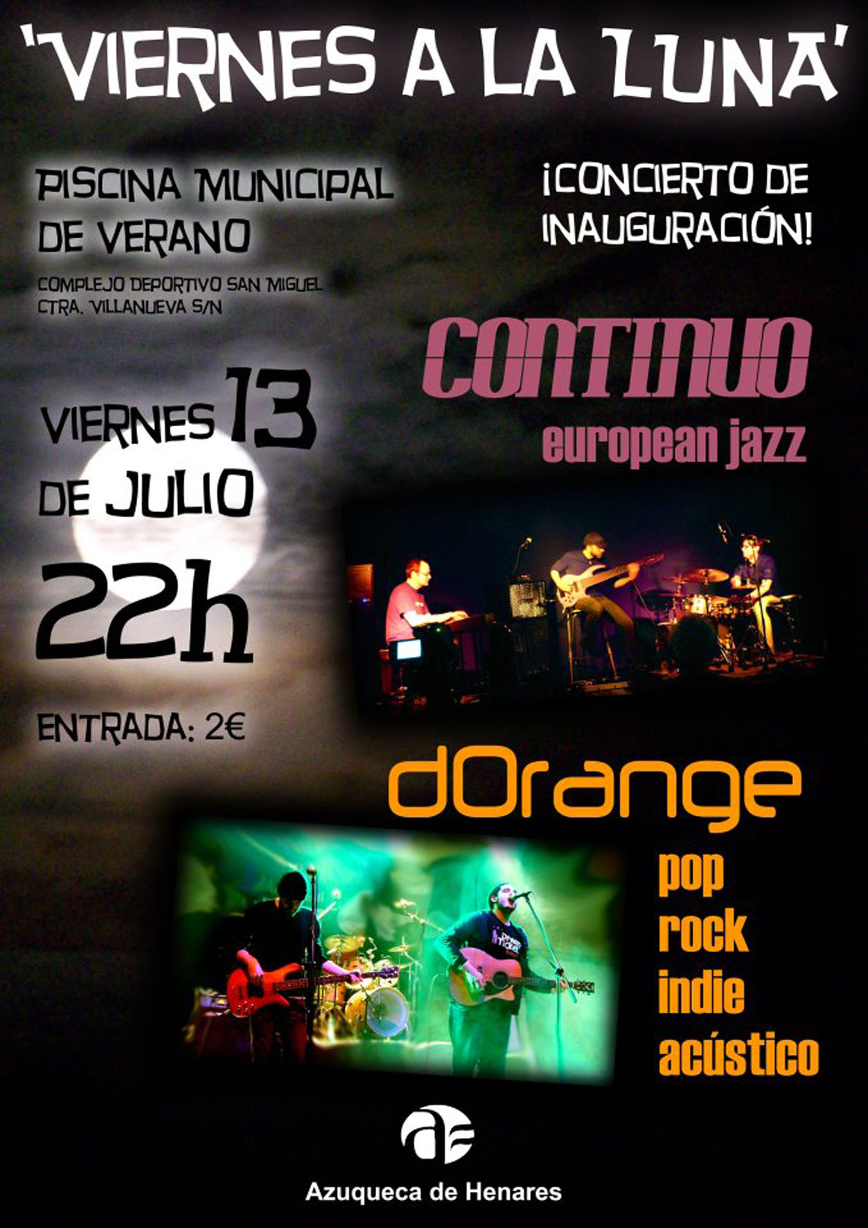 La piscina de verano del Complejo San Miguel acoge este viernes, 13 de julio, la primera de las cuatro jornadas de ocio nocturno organizadas por el Ayuntamiento de Azuqueca de Henares en el marco del programa ‘Los viernes a la luna’. “Se trata de una iniciativa con la que se pretende ampliar la oferta de tiempo libre del municipio con propuestas saludables y para todos los públicos, en especial, los jóvenes”, explica la concejala de Juventud, Sagrario Bravo, quien recuerda que “el verano pasado, cerca de 1.500 personas participaron en alguna de las actividades organizadas”.El recinto permanece abierto desde las 21 horas hasta la 1 de la madrugada y el precio de la entrada es de 2 euros. Además de permitirse el baño libre, esta primera cita de la segunda edición de ‘Los viernes a la luna’ tendrá como aliciente la actuación de los grupos locales ‘Continuo’ y ‘dOrange’. Está previsto que el primer concierto comience a las 22 horas a cargo de ‘Continuo’, un trío de jazz formado por Sergio Dijs (piano), Guillermo Chicharro (bajo) e Iván Ramos (batería). A continuación, tocará ‘dOrange’, otro trío que tiene un estilo alternativo y pop-rock y está compuesto por Lucas Meseri (voz y guitarra), Guillermo Chicharro (bajo y coros) y Óscar Abad (batería).Este programa de ocio nocturno, en el que colaboran las Concejalías de Cultura, Deportes y Juventud, continúa el 27 de julio con una noche de chill out y, ya en agosto, los días 17 y 31, con una noche del humor y una fiesta del final del verano, respectivamente.