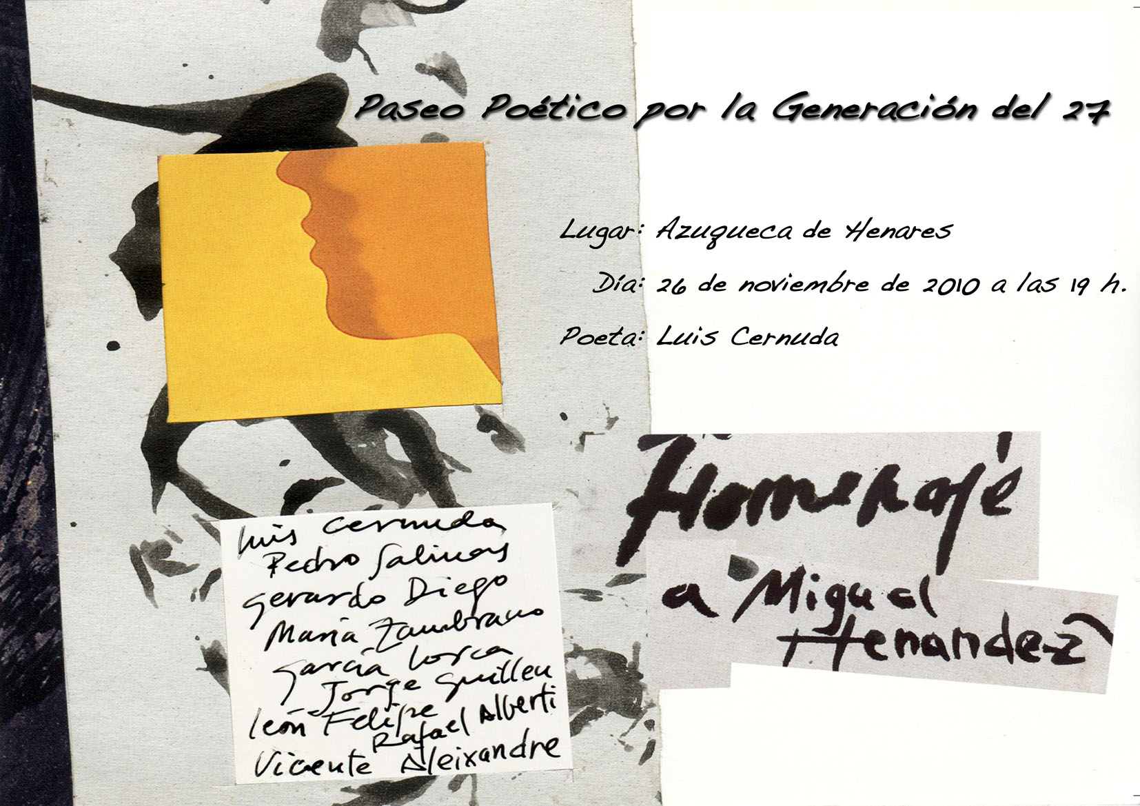 El poeta Luis Cernuda protagoniza en Azuqueca de Henares el viernes 26 la primera etapa del programa 'Paseo poético por la Generación del 27' puesto en marcha por ocho bibliotecas municipales de Guadalajara: las de Azuqueca de Henares, Humanes, Yunquera, Brihuega, Cabanillas del Campo, El Casar, Marchamalo y Fontanar. Con esta iniciativa, que se desarrolla coincidiendo con el centenario del nacimiento de Miguel Hernández, las bibliotecas pretenden potenciar la lectura de poesía.