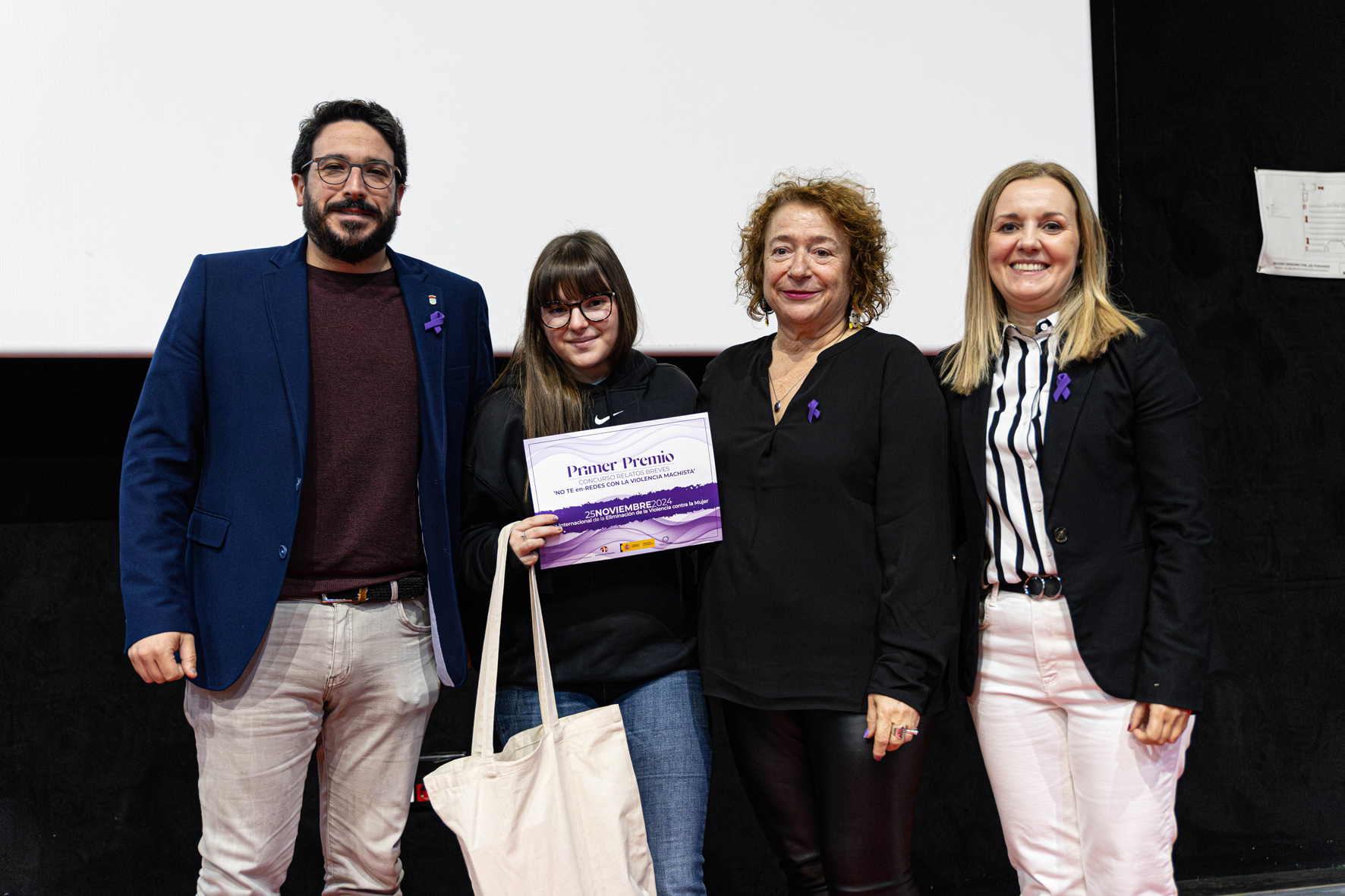 Como cierre, se ha hecho entrega de los premios del concurso de relatos breves “No te en-redes con la violencia machista”, convocado por el Ayuntamiento y dirigido al alumnado de 1º de Bachillerato, a cargo del alcalde, la concejala de Igualdad y la delegada provincial de Igualdad. Las finalistas han sido, por orden descendente, Natalia Canorea (altavoz, IES Arcipreste de Hita), Inés Moya (auriculares, IES Arcipreste de Hita) y Verónica Díaz (batería externa, IES San Isidro).