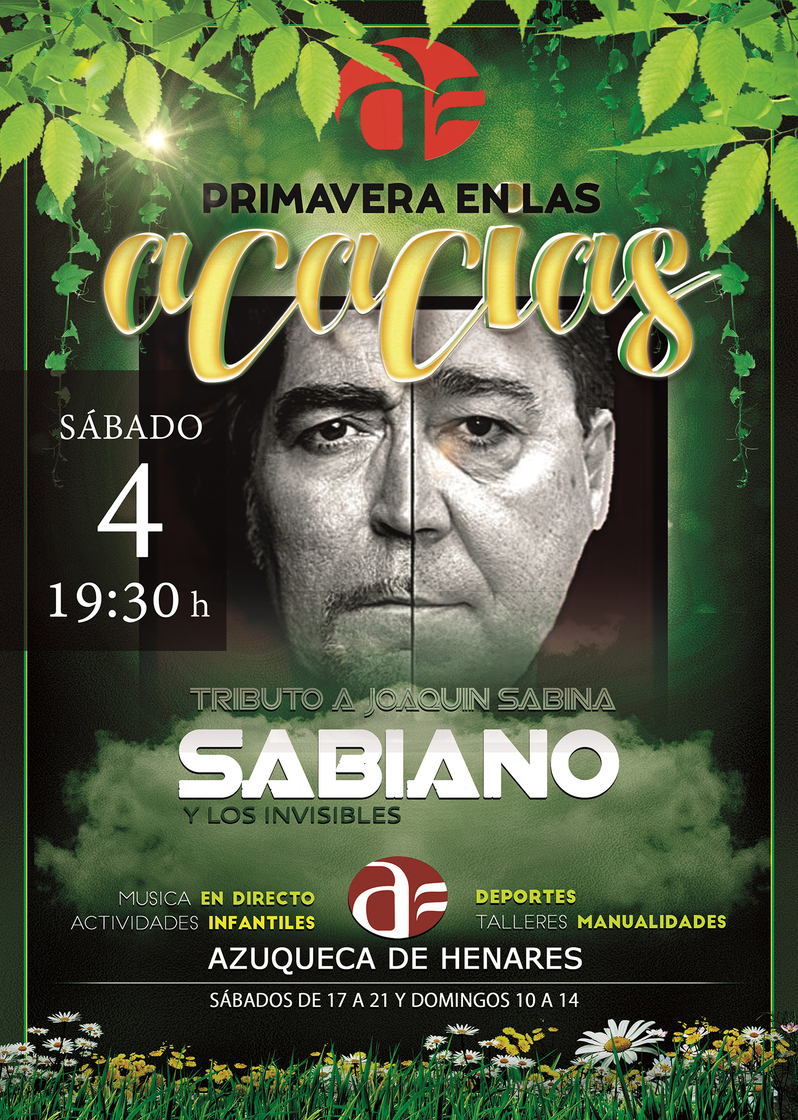 El programa de ocio familiar 'Primavera en Las Acacias' que impulsa el Ayuntamiento de Ayuntamiento de Henares ofrece este sábado una actuación musical de tributo a Joaquín Sabina a cargo de 'Sabiano y los invisibles' (desde las 19:30 horas) y una nueva Jornada asociativa de 'Conexión asociativa' que propone la actividad 'Decorando Azuqueca entre todos y todas' (de 16 a 18 horas).Además, y como en el resto de jornadas de 'Primavera en Las Acacias', habrá actividades infantiles y deportivas y distintos talleres a lo largo del fin de semana, en concreto, el sábado de 17 a 21 horas y el domingo, de 10 a 14 h.