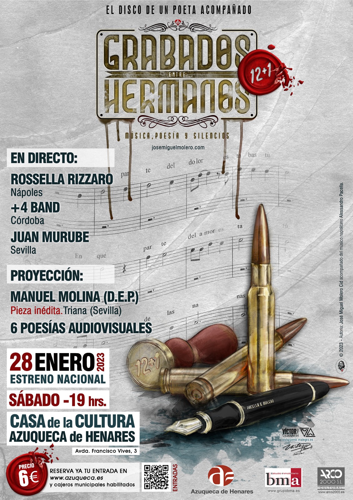 El poeta José Miguel Molero (Premio internacional de poesía Francisco de Quevedo) junto con el músico napolitano Alessandro Pacella (Opera Nera) presentan en primicia nacional el proyecto Grabados entre hermanos 12 + 1, un proyecto de poesía actual, social y reivindicativa. Poesía, música y cine que explican cómo comunicar la poesía de manera distinta. Actuación en directo del grupo Cordobés + 4 Band (Rap) y la cantante napolitana Rossella Rizzaro.