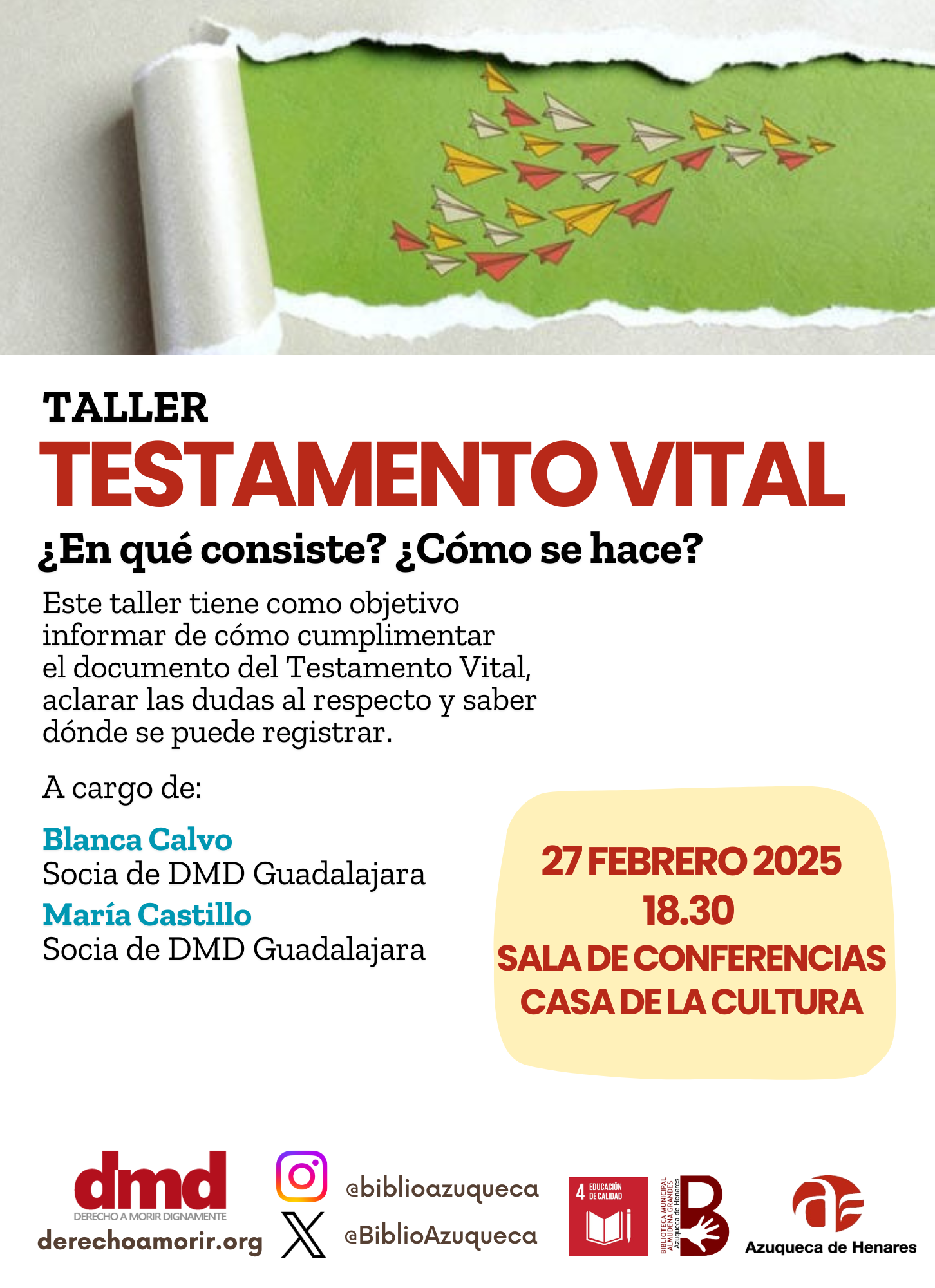 Ese es el tema del taller de testamento vital que el grupo de Guadalajara de Derecho a Morir Dignamente dará en la Biblioteca Municipal de Azuqueca el día 27 de febrero de 2025. En aproximadamente dos horas, enseñará a rellenar los impresos que el SESCAM tiene dispuestos para que puedan hacer el registro de sus voluntades anticipadas. Y para que, una vez hecho ese trámite, tengan la serenidad de saber que su muerte será lo más dulce posible”.