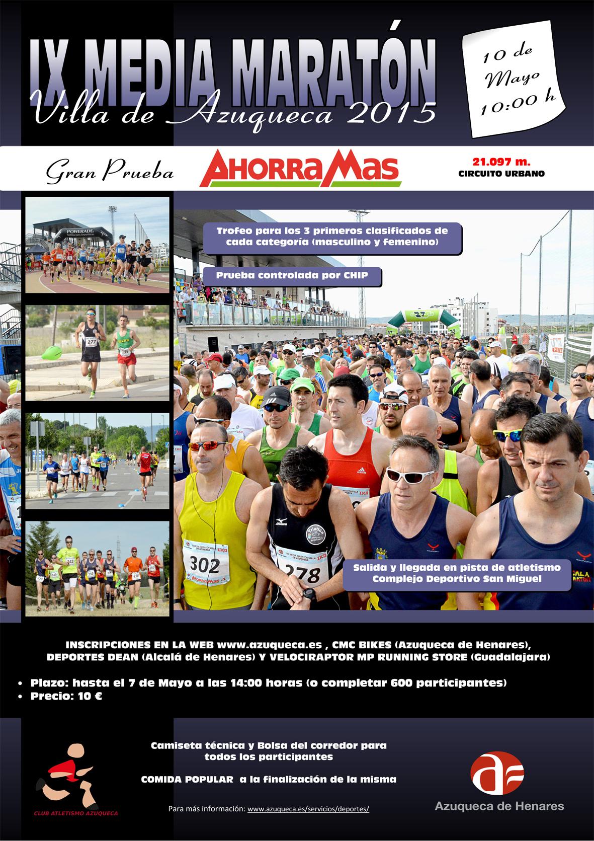 Cerca de 300 corredores se han inscrito ya en la novena edición de la Media Maratón 'Villa de Azuqueca', que se disputa este domingo, 10 de mayo y se dirige a mayores de edad. El plazo para formalizar la participación se mantiene abierto hasta las 14 horas del jueves día 7 y las personas interesadas pueden registrarse a través de internet (pinche aquí), o bien, de manera presencial en las tiendas CMC Bikes (Azuqueca de Henares, c/ Santiago Ferrer, 8), Deportes Dean (Alcalá de Henares, Paseo de la Alameda, 23) y Velociraptor MP Running Store (Guadalajara, c/ Doctor Fleming, 4). El precio es de 10 euros.La prueba, que organiza el Ayuntamiento en colaboración con el Club de Atletismo de la localidad, dará comienzo a las 10 horas ydiscurre por un circuito urbano, con salida y llegada en la pista de atletismo del complejo San Miguel. La distancia total es de 21,097 kilómetros (tres vueltas), pero también se ofrece la posibilidad de dar una (7 km.) o dos vueltas (14 km.), aunque en ese caso no se opta a los premios.Premios y categorías