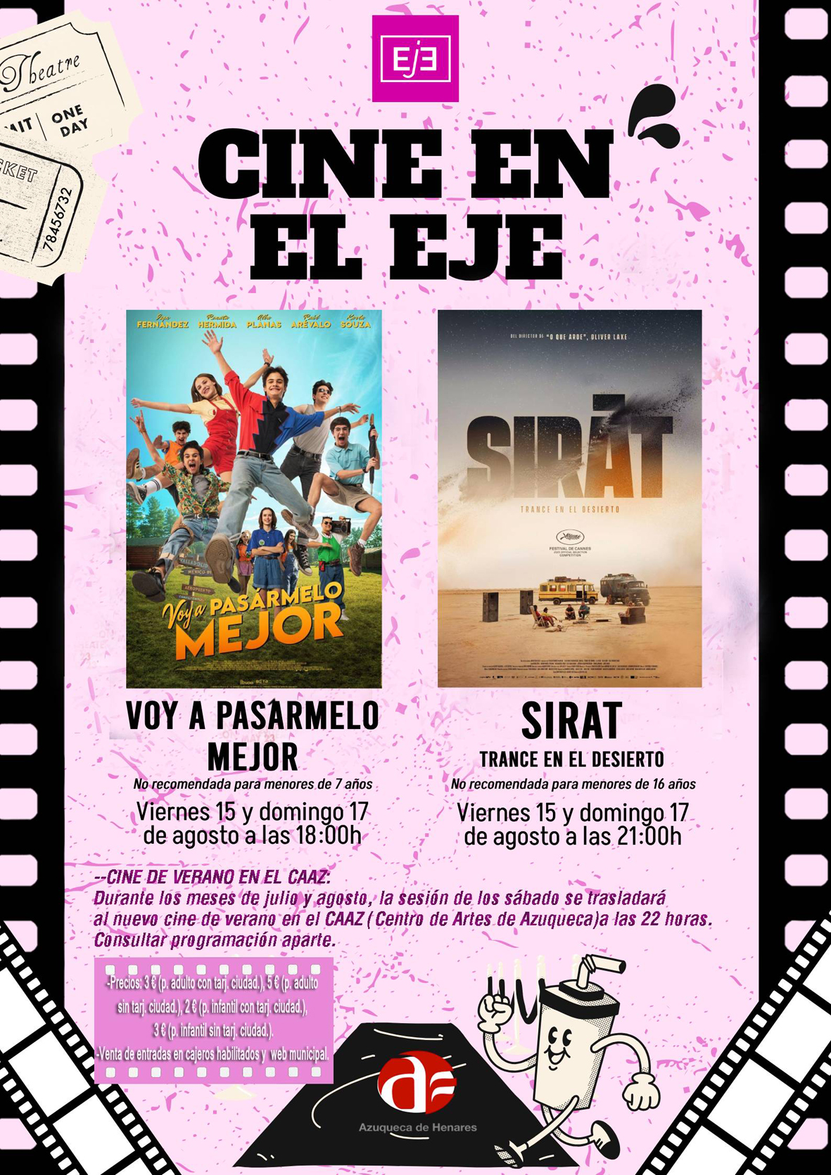 La agenda de ocio en Azuqueca de Henares ofrece este fin de semana tres propuestas cinematográficas. Por un lado, la cartelera comercial de la sala del Espacio Joven Europeo (EJE) incluye, como es habitual, dos películas que se proyectarán el viernes 15 y el domingo 17 de agosto en distinto horario: a las 18 horas, “Voy a pasármelo mejor” (no recomendada para menores de 7 años), y a las 21 horas, “Sirat. Trance en el desierto” (no recomendada para menores de 16 años). Las entradas, con Tarjeta Ciudadana, tienen un precio de 2 euros para el público infantil y de 3 euros para el público adulto y, sin este documento municipal, de 3 y 5 euros, respectivamente.
