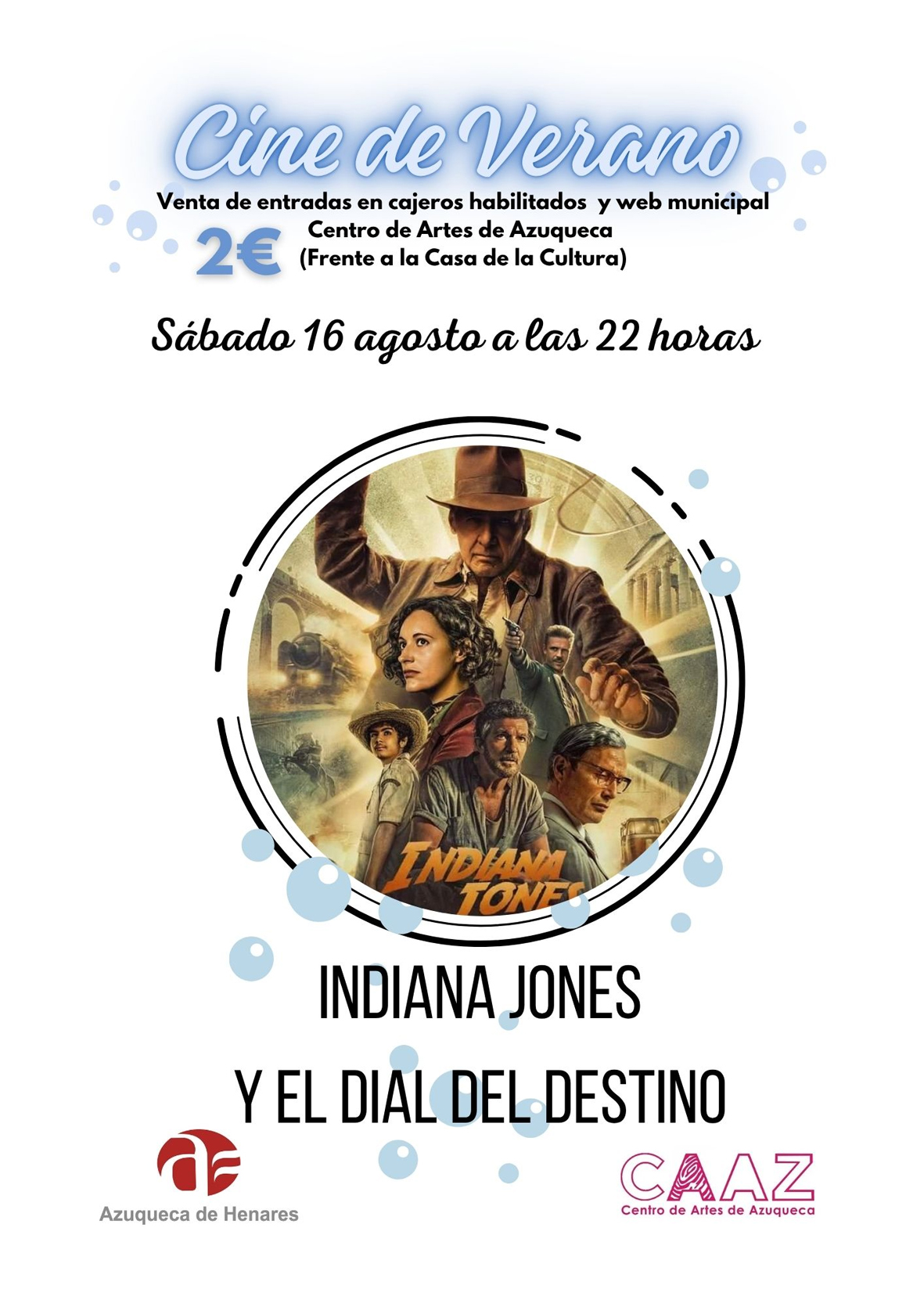 Por otra parte, la programación del Cine de Verano continúa este sábado 16 de agosto con “Indiana Jones y el dial del destino” (no recomendada para menores de 12 años), que se podrá ver a partir de las 22 horas en la terraza del Centro de Artes de Azuqueca. Es precio es de 2 euros.