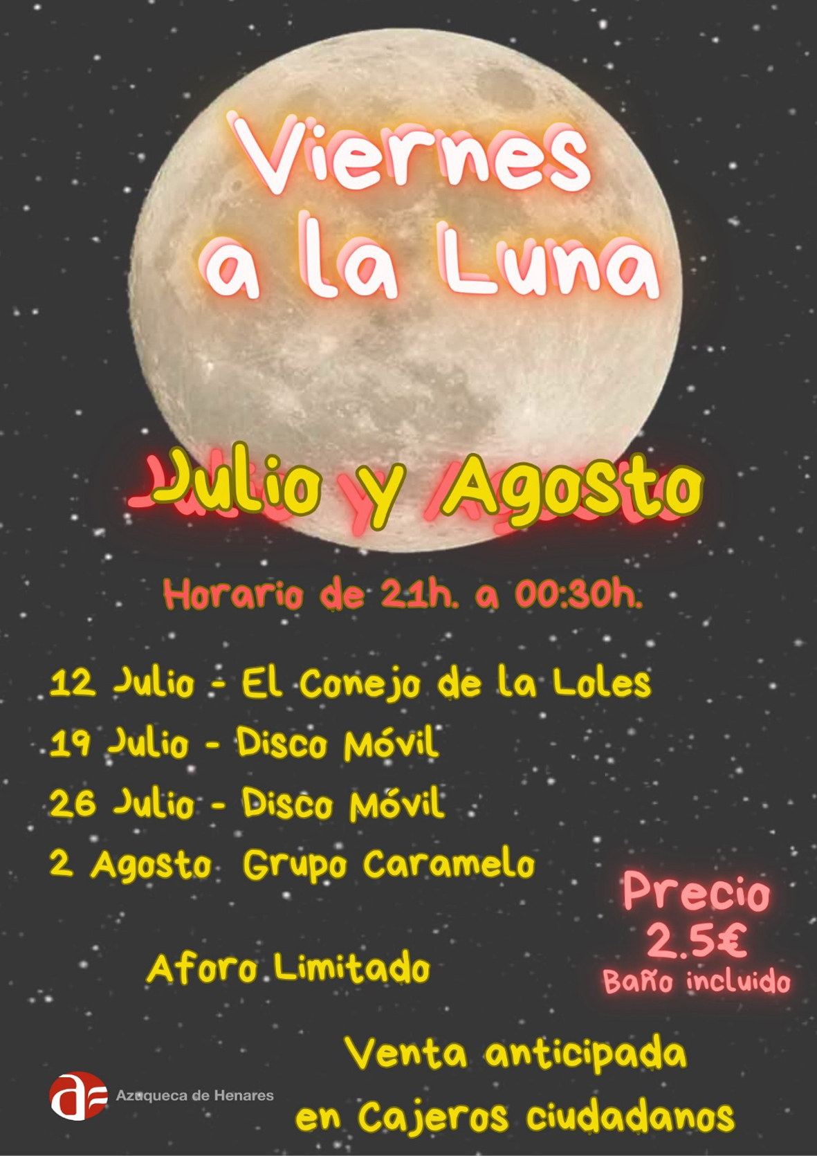 El Ayuntamiento de Azuqueca de Henares lanza una nueva edición del programa municipal Viernes a la Luna, que comienza el día 12 de julio con la actuación de la charanga local “El conejo de la Loles” en la piscina de verano, ubicada en el complejo San Miguel. Las entradas para esta primera cita ya están a la venta y se pueden adquirir al precio de 2,5 euros en los cajeros ciudadanos -el aforo es limitado y, en caso de quedar localidades, se podrán adquirir en la taquilla de la piscina-.