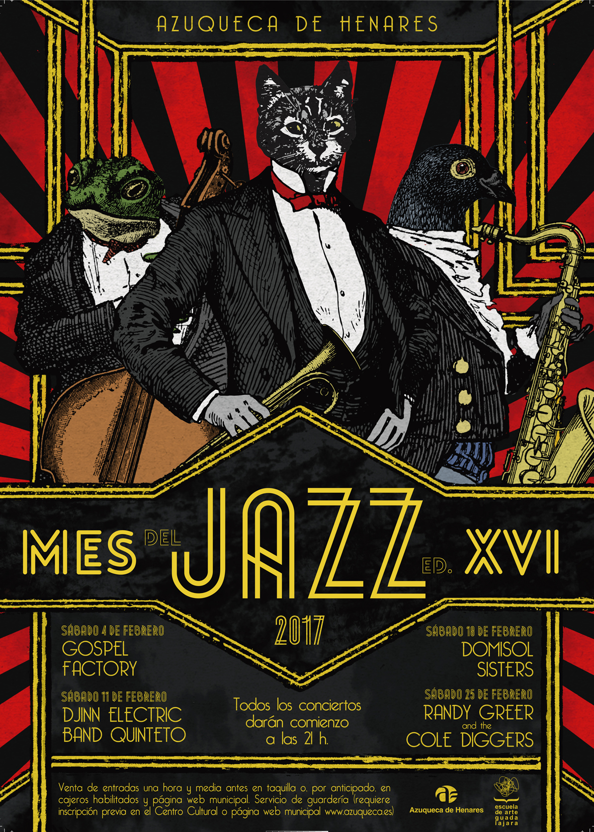 Como cierre de esta edición, la Casa de la Cultura recibe a Randy Greer and the Cole Diggers. "Este cantante norteamericano sigue la línea más pura del jazz y es considerado uno de los herederos de Nat King Cole".Exposición de cartelesPor otra parte, del 3 al 27 de febrero, se puede visitar en la entrada de la Casa de la Cultura de Azuqueca de Henares una muestra con los carteles presentados por los alumnos del ciclo formativo de grado superior de Gráfica Impresa que se imparte en la Escuela de Arte de Guadalajara. "Desde hace cinco años, la escuela colabora con el Ayuntamiento en el diseño del cartel del Mes del Jazz", recuerda Sagrario Bravo, quien destaca la calidad de las obras.Se entregaron un total de 28 propuestas, de las que se seleccionaron cinco y, al final, se eligió el trabajo de Carlos Saboya Bengochea (los otros seleccionados fueron David Abad Muñoz, Lucía Bachiller Fabre, Lourdes Quesada Balsera, y Víctor García Batanero).