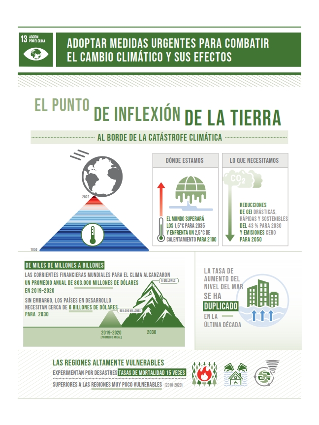El cambio climático es consecuencia de la actividad humana y esta amenazando nuestra forma de vida y el futuro de nuestro planeta. Haciendo frente al cambio climático podremos construir un mundo sostenible para todos. Pero tenemos que actuar ahora.Metas del Objetivo 13