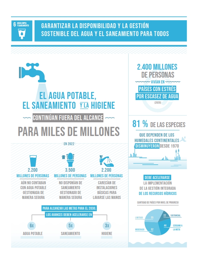 En el año 2022, 2200 millones de personas continuaban sin agua potable gestionada de manera segura, entre los que 703 millones no contaban con un servicio básico de agua; 3500 millones de personas carecían de saneamiento gestionado de manera segura, de los cuales 1500 millones no disponían de servicios básicos de saneamiento; y 2000 millones carecían de una instalación básica para lavarse las manos, lo que incluye a 653 millones de personas sin ninguna instalación para lavarse las manos.