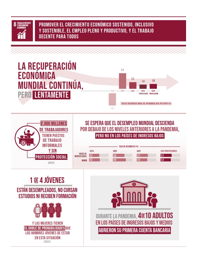 La consecución del Objetivo 8 exigirá una reforma en profundidad del sistema financiero para hacer frente al aumento de la deuda, a la incertidumbre económica y a las tensiones comerciales, promoviendo al mismo tiempo una remuneración equitativa y un trabajo digno para los jóvenes.