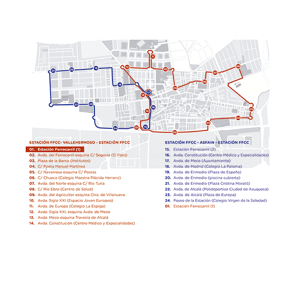 Paradas en Azuqueca: confluencia entre la avenida del Siglo XXI y la carretera de Villanueva y avenida de Los Escritores, 2. Resto de paradas: Alcalá, San Fernando y Madrid (intercambiador de avenida de América).Se puede utilizar el ABONO MENSUAL DE TRANSPORTE de la Comunidad de Madrid Zona E1.